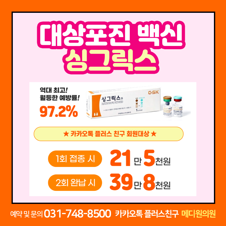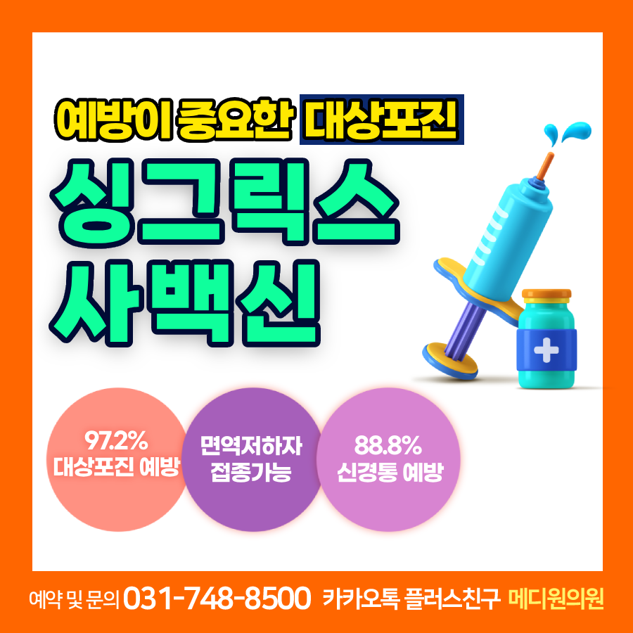 오늘은 대상포진 예방접종의 새로운 백신인 싱그릭스에 대해 알려드리는 시간을 가져봤습니다. 대상포진은 50세 이상 성인 3명 중 1명꼴로 발생한다고 합니다. 97% 이상의 예방효과를 지닌 싱그릭스는 대상포진을 효과적으로 예방할 수 있습니다.